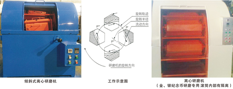 置四個滾筒(四個研磨槽)或六個滾筒,滾筒即隨圓盤高速旋轉(zhuǎn)和自轉(zhuǎn)的相對運(yùn)動,從而得到了滾筒中零件和磨料、水、